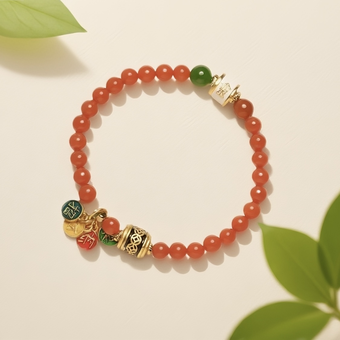 「龍之金」手串,紅珠鮮妍映綠珠清潤,金飾精巧綴吉慶墜,腕間繞出龍紋貴氣,日常點染滿滿鲜活好運。