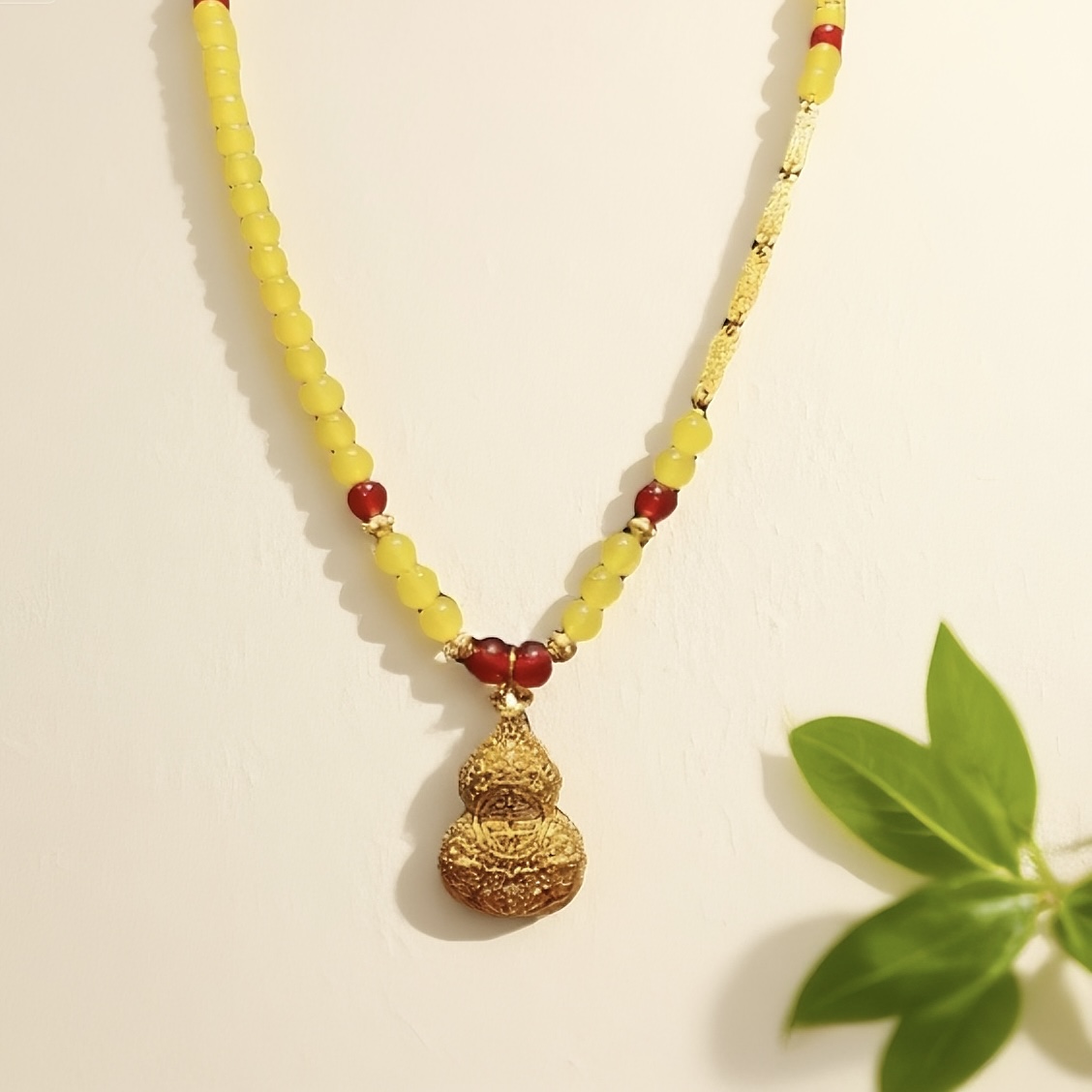 「妙納無盡」珠串,暖韻主鏈襯緋紅綴飾,金葫蘆吊墜浮雕精緻,藏納福聚運之願,日常佩於頸間,韻致與心意皆綿長。