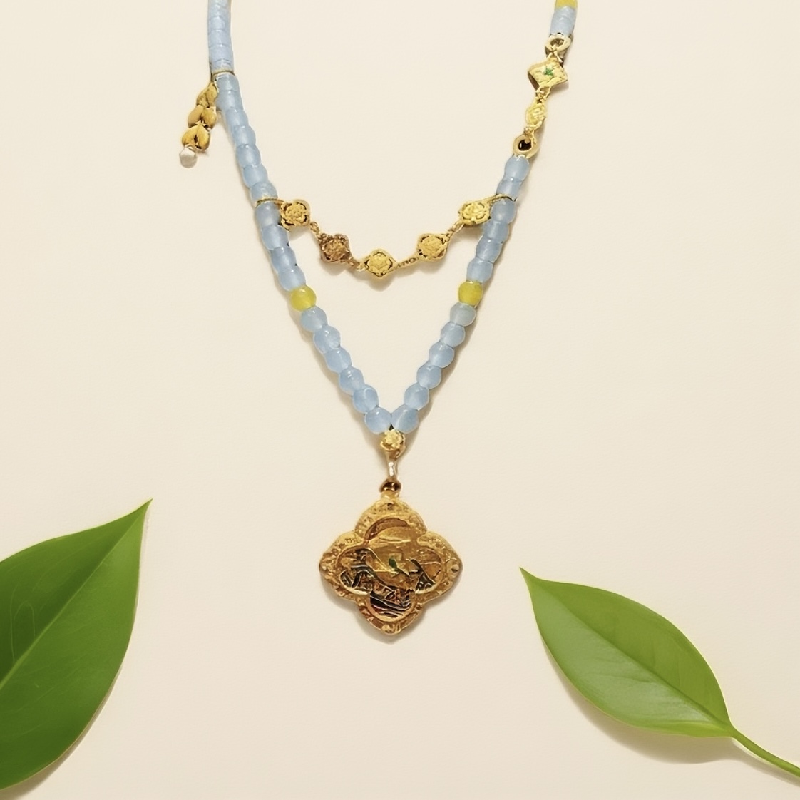 這款「珠聯璧合」項鍊結合了柔和的淡藍色珠串與華麗的金色細節,展現東方雅緻與現代時尚的完美結合。吊墜上雕有精緻圖案,寓意圓滿與和諧,為日常或正式場合增添典雅韻味。