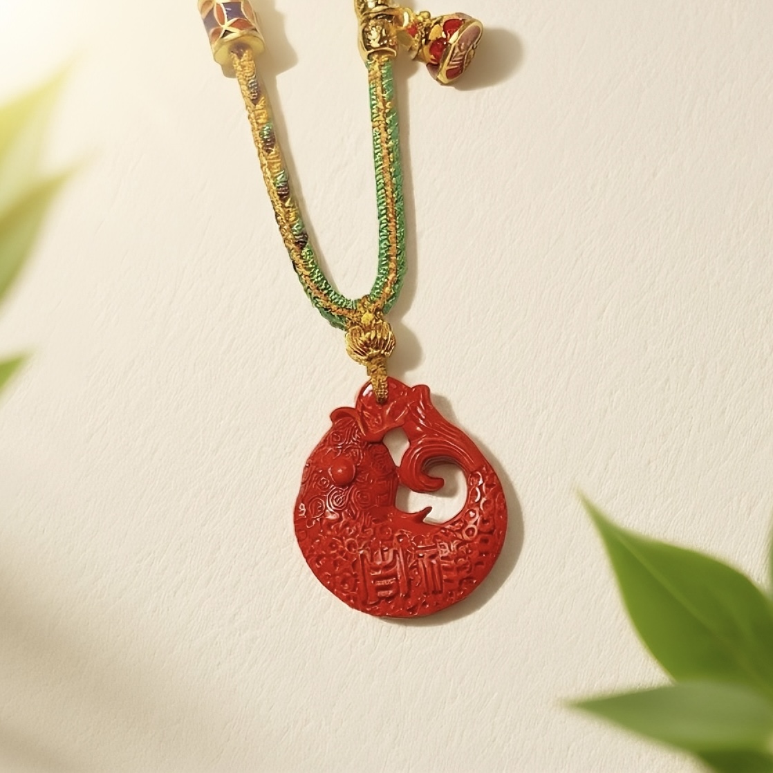 此款「富貴吉祥朱砂牌」以鮮紅朱砂雕刻成祥瑞魚形,寓意年年有餘與財富滾滾。搭配金綠相間的編繩與細緻金飾,展現東方傳統文化之美與吉祥祝福。無論配戴或贈送,皆是傳遞祝福與好運的上選。